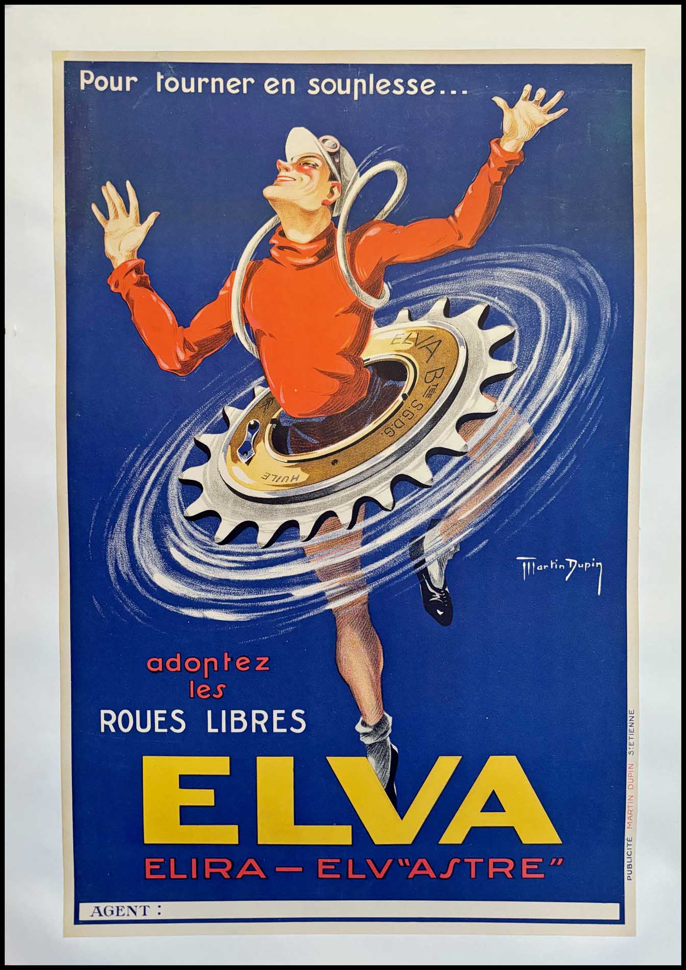Martin DUPIN : Roues libres ELVA, affiche ancienne originale cycles 1930
